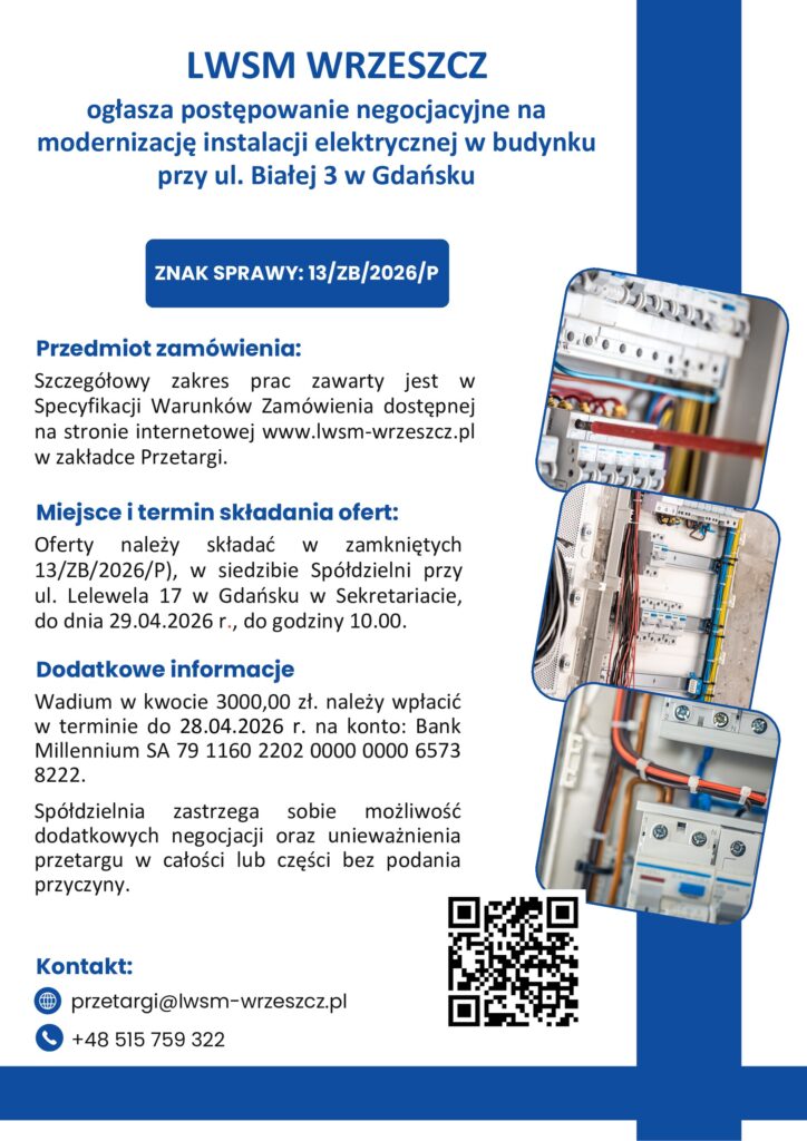 Oferty należy składać w zamkniętych kopertach z dopiskiem „Negocjacje – 13/ZB/2026/P), w siedzibie Spółdzielni przy ul. Lelewela 17 w Gdańsku w Sekretariacie, do dnia 29.04.2026 r., do godziny 10.00.