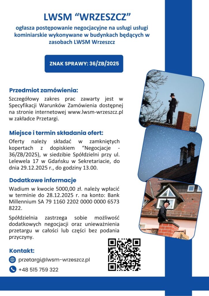 ogłasza postępowanie negocjacyjne na usługi kominiarskie wykonywane w budynkach będących w zasobach LWSM Wrzeszcz