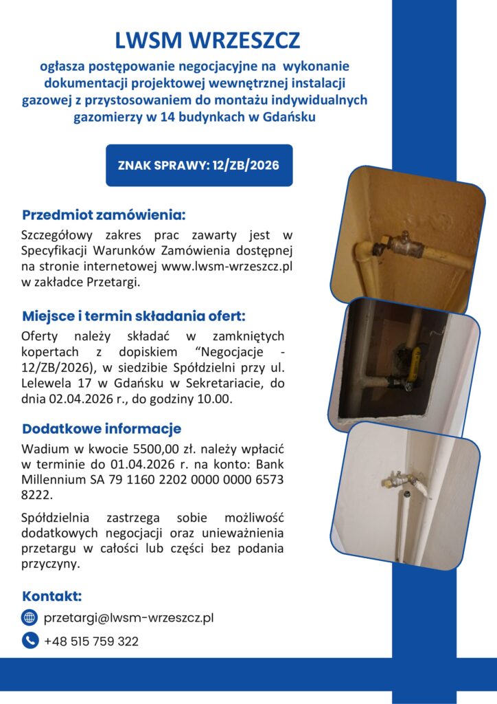 Oferty należy składać w zamkniętych kopertach z dopiskiem „Negocjacje – 12/ZB/2026), w siedzibie Spółdzielni przy ul. Lelewela 17 w Gdańsku w Sekretariacie, do dnia 02.04.2026 r., do godziny 10.00.