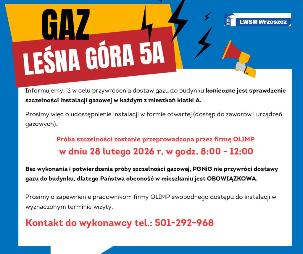 UWAGA – przywrócenie dostaw gazu w budynku przy ul. Leśna Góra 5 klatka A